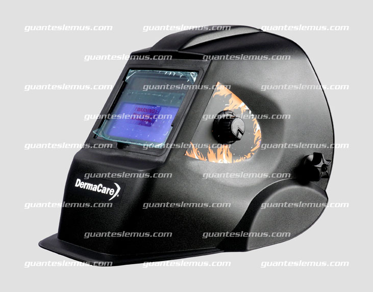 Fabricada en material termoplástico, cuenta con batería de litio reemplazable. La sombra antes de activar la batería es DIN 4. Una vez activada, la sombra es DIN 9-13.v. La velocidad de obscurecimiento es de 0.1 ms. El campo visual es de 90 x 40, bueno para uso TIG, MIG, ARC. Ajuste manual externo para sensibilidad. Cumple con la norma EN 166:2001 y ANSI Z87.1-2010. Cuenta con banda ajustable con sistema de matraca. Protege cara, oídos y cuello.