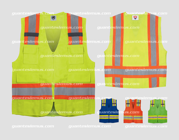 Chaleco ejecutivo de alta visibilidad de diseño único. Fabricado al frente con poliéster de punto cerrado y en la espalda con malla tipo jersey para hacerlo ligero y fresco. Con cintas reflejantes de 2″ en los hombros, en el frente y en la espalda. Cierre industrial reforzado y costuras reforzadas. Cuenta con cuatro compartimento frontales: 2 de 15×27 cm, uno de 9×12.5 cm, y uno de 12.5×12.5 cm.