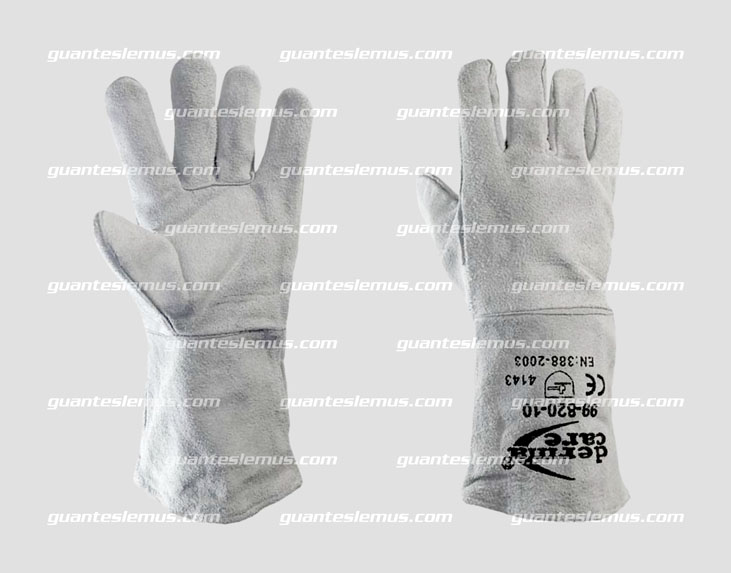 Guante de carnaza gris de res. Hilo de algodón. Puño recto 14” pulgadas. Forro interno. La protección en nudillos y uñeros brinda larga duración al guante.