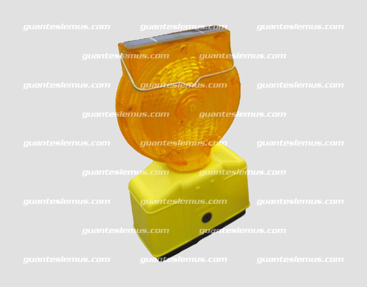 Lámpara LED de destello color ámbar fabricada en poliestireno. La base está fabricada en polipropileno. Cuenta con una celda solar en la parte superior. La pieza completa mide 33 cm de alto, 20 cm. de ancho y 10 cm. de profundidad. Puede colocarse sobre trafitambos.